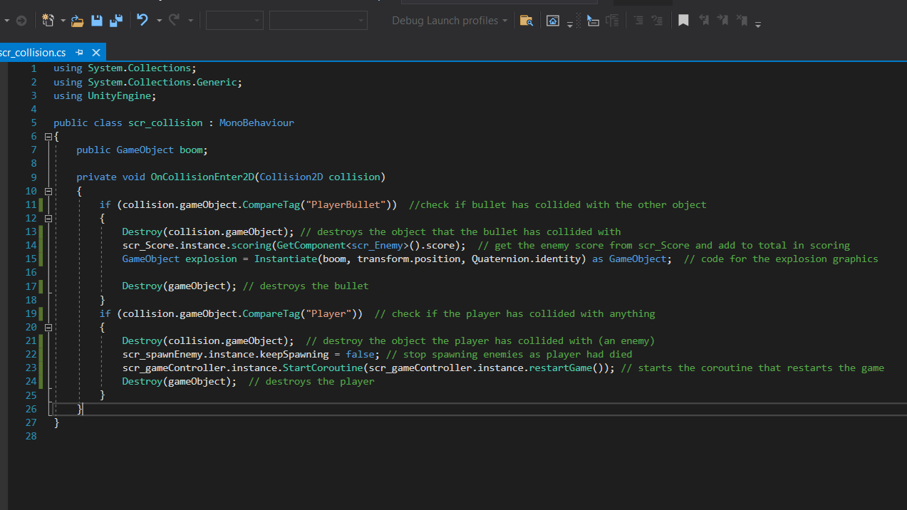 The collision code is attached to the player and the player bullet and is activated whenever either of them collide with anything.