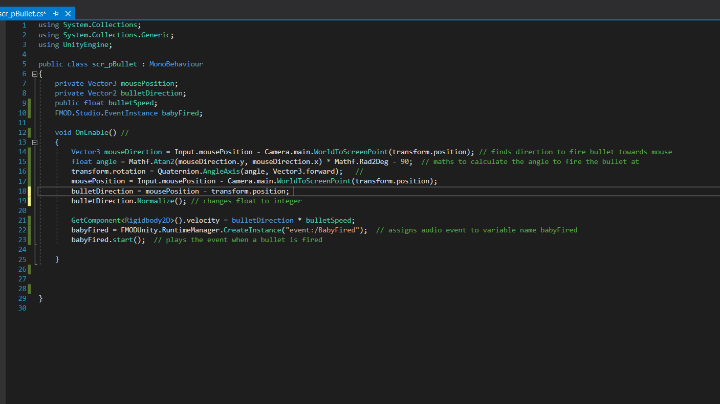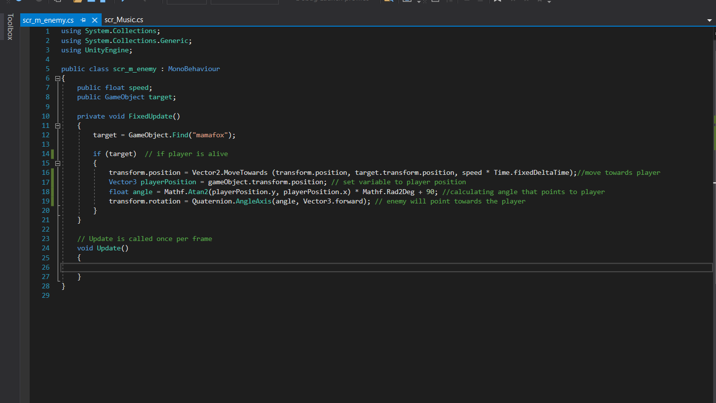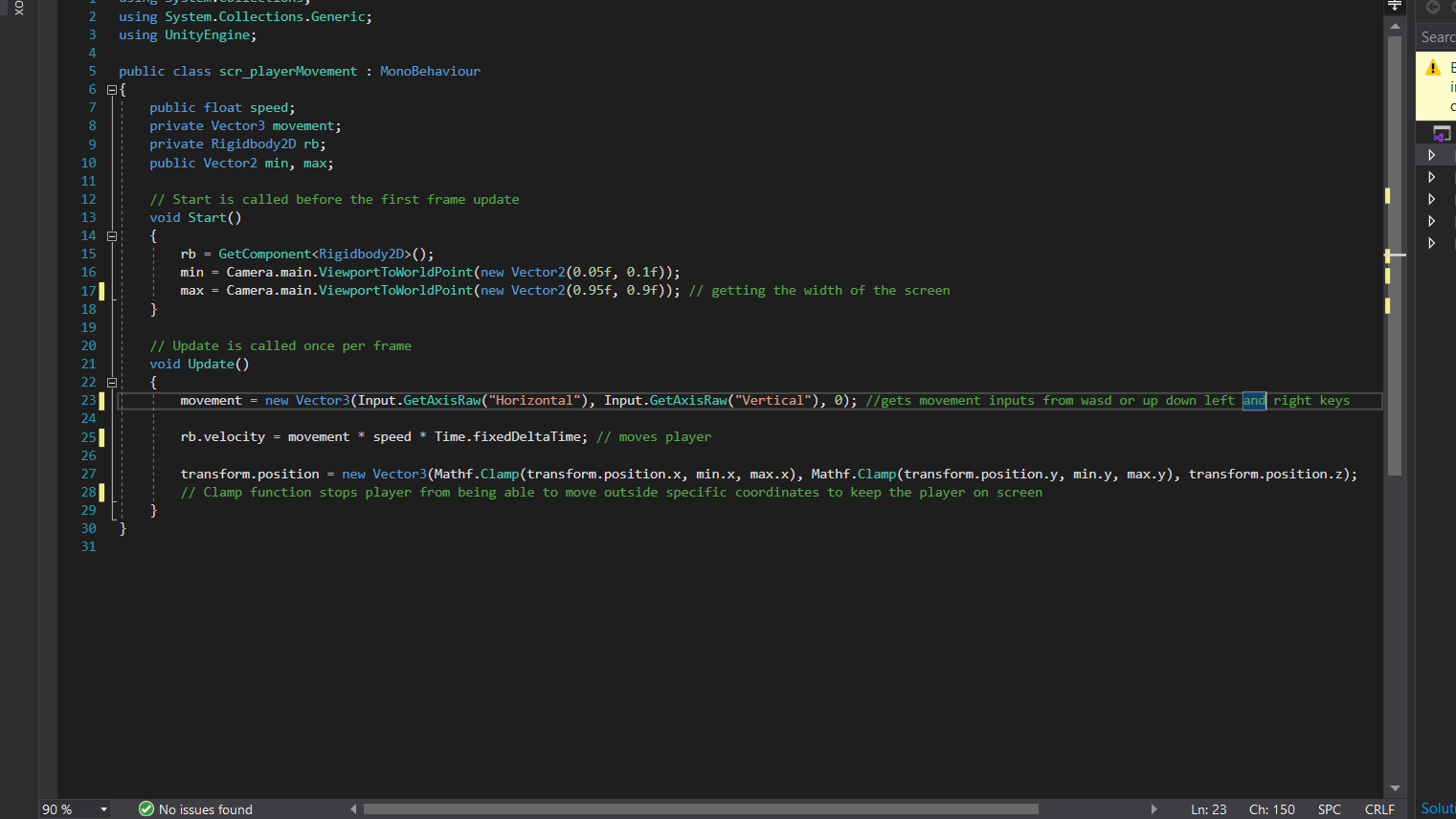 This script has the code that allows the player to move and contains the movement to a specific area on the screen to prevent the sprite getting stuck outside of sight of the player. Vector3 stores a position with x, y and z coordinates.