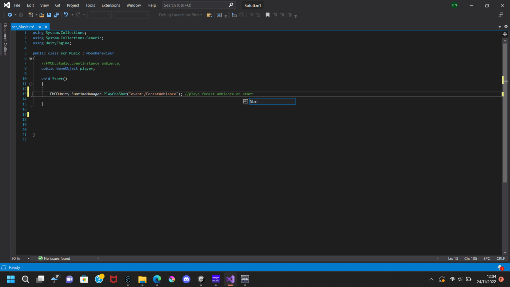 The FMOD code play one shot triggers the forest ambience event once but as the FMOD file loops it plays the whole time the game is running.