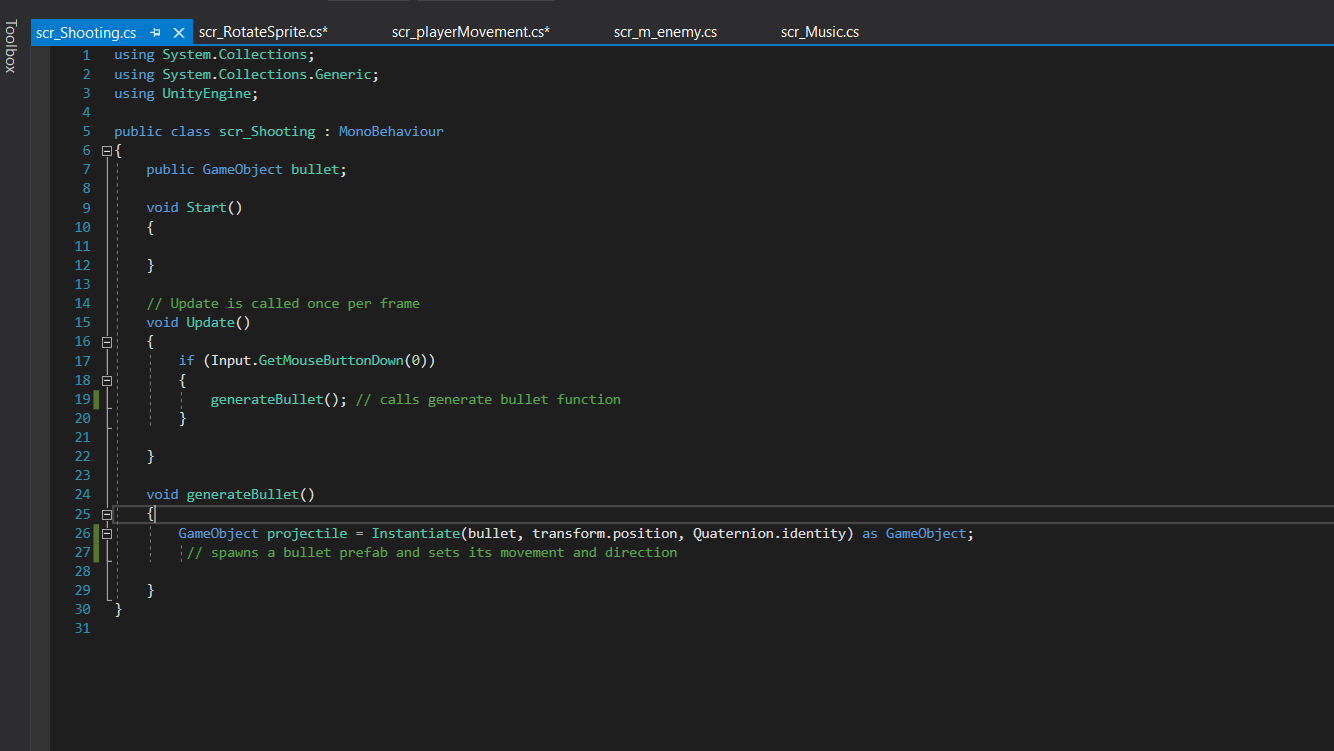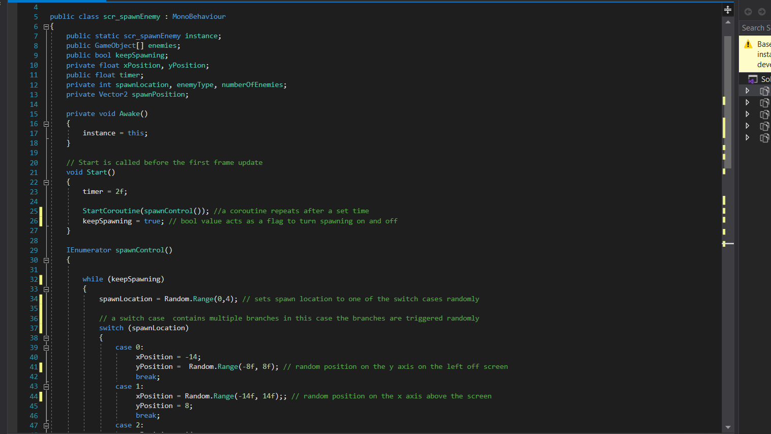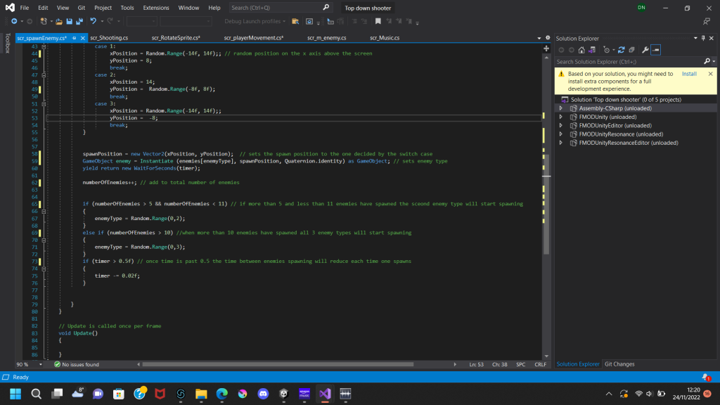 The coroutine runs every 2 seconds to begin with and with each enemy spawned reduces to gradually increase the difficulty of the game – this can be seen on line 73 where 0.2f is subtracted from the timer. As more enemies are spawned the variety of enemy types increases this can be seen in the if statement on line 65. The spawn location of the enemies is randomised using a switch case which has 4 options each with a row of possible spawn locations that form a box around the camera so that enemies can spawn anywhere around the player offscreen.