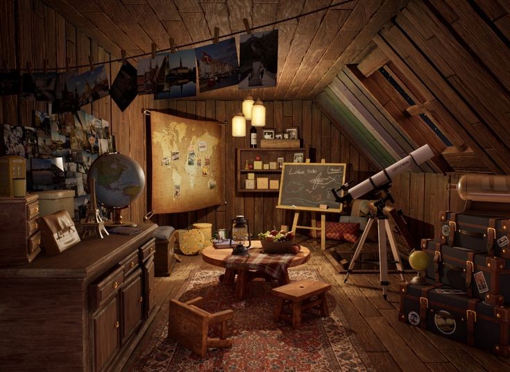 The cluttered cosy interiors in these inspiration images would contrast with the large open landscapes outside and would be something I would aim to reproduce in my own environment.