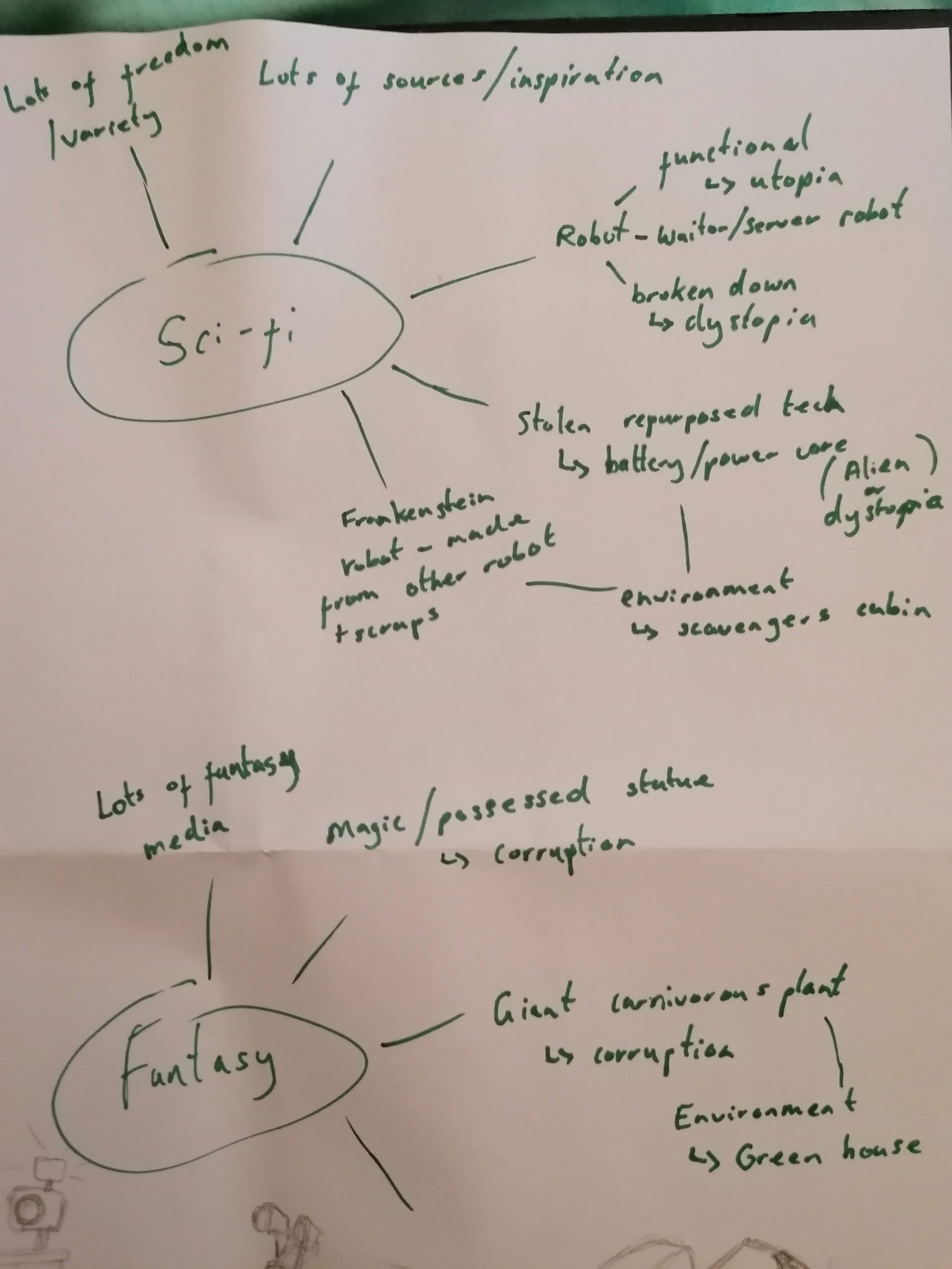 I brainstormed two different sci-fi robots one being a server robot that would have a tray with cocktails glasses on it if it was utopian or be broken and knocked over for dystopian and a robot made from scrap by a scavenger.