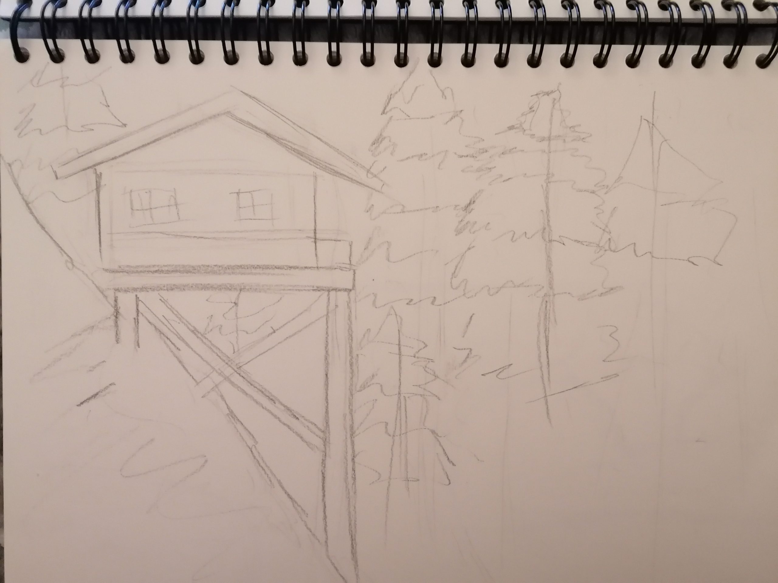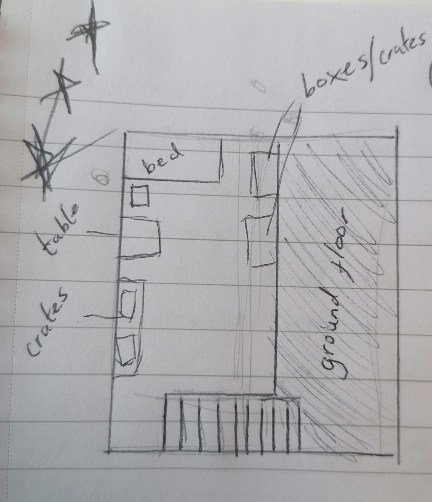 This rough sketch shows the basic outline for my sci-fi idea for a scavengers cabin in the woods, this would be fitting a sci-fi dystopian theme and would be set after apocalyptic events which either caused the majority of people to evacuate the Earth or perish.