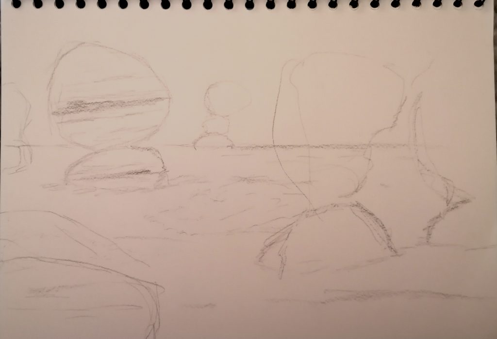 This is a sketch of a landscape I came up with in a dream; it’s a never-ending shallow sea with smooth rocks stacked in towers scattered across the vast ocean. It could be a sci-fi environment of an alien planet or a transformed Earth in the far future.