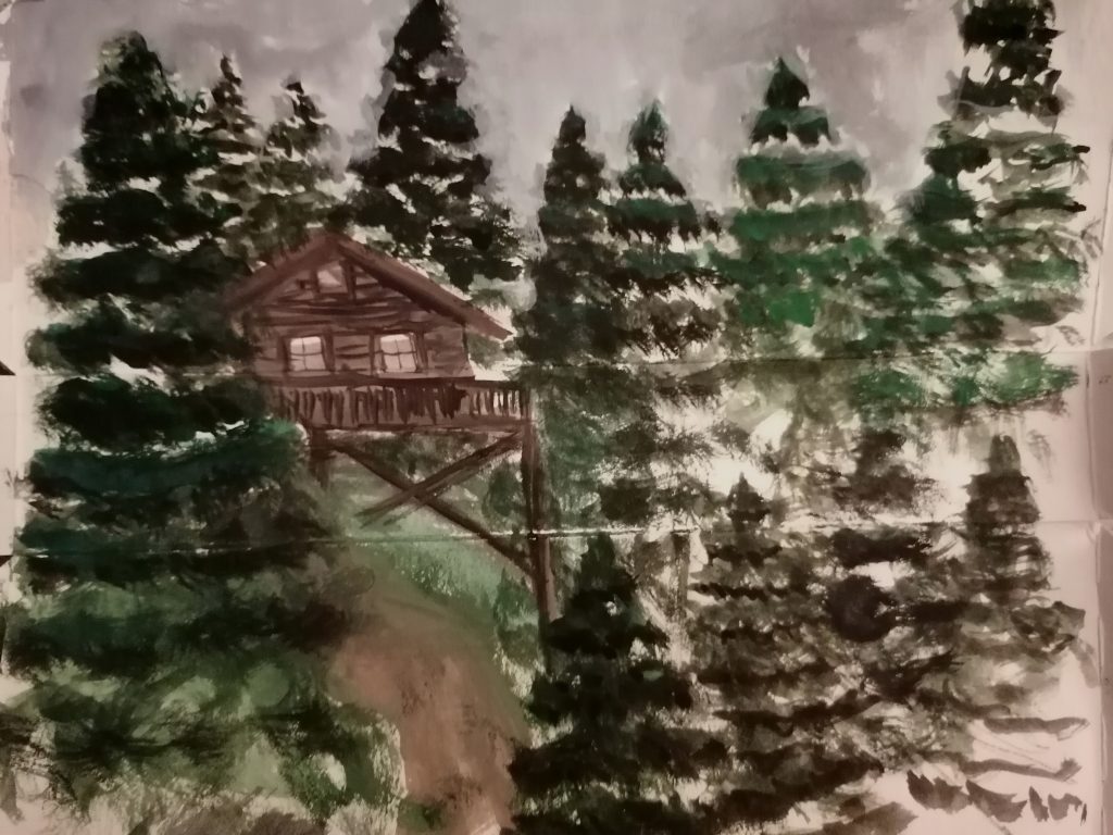 This painting shows the main colour scheme I plan on using for the external environment as well as a clearer depiction of the layout. I intend for the cabin to be on the slope into a valley so to the right of this image there would be another mountain in the environment.