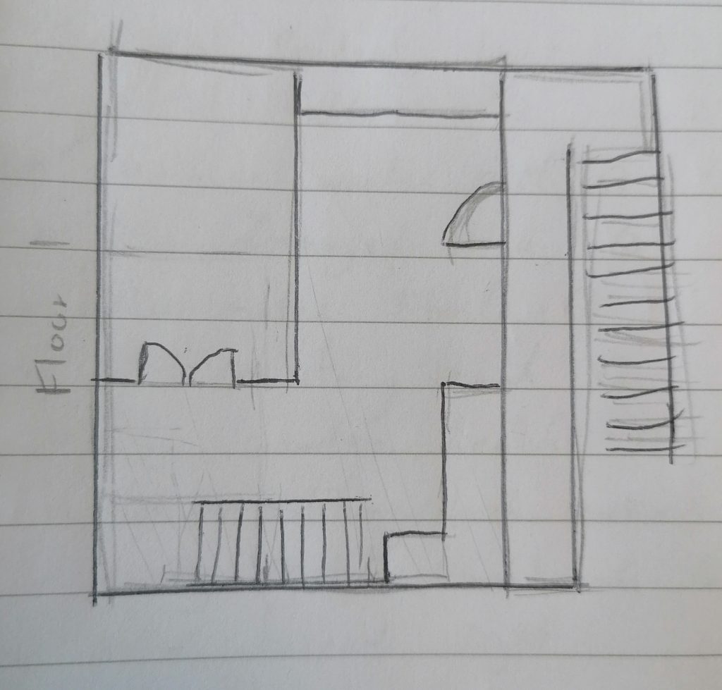 The bottom floor will be two rooms one being the majority of the space with a smaller one behind for a bathroom. The main room will have desks in the front corners as work stations for building electronics and fixing up items.