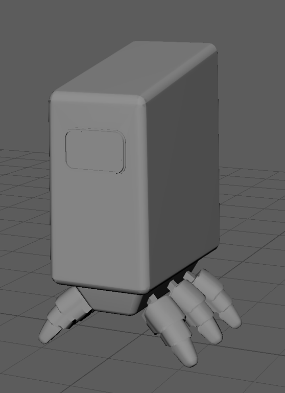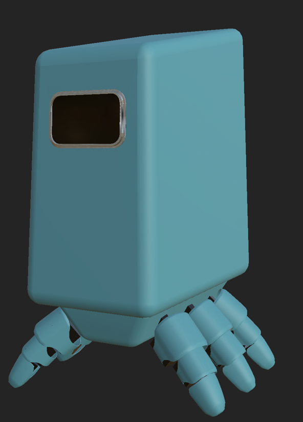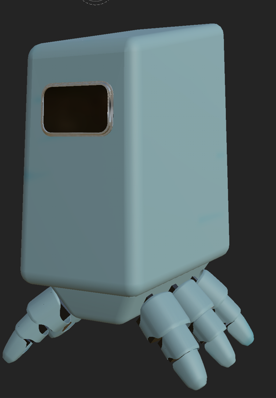 The place where the legs attach was made in a similar way with the vertexes on the bottom face of a cube being scaled before all the edges were bevelled. The top edges were bevelled separately from the other edges as it is where it would attach to the body so I thought having it bevelled would make it harder to attach if it were a real object being built.