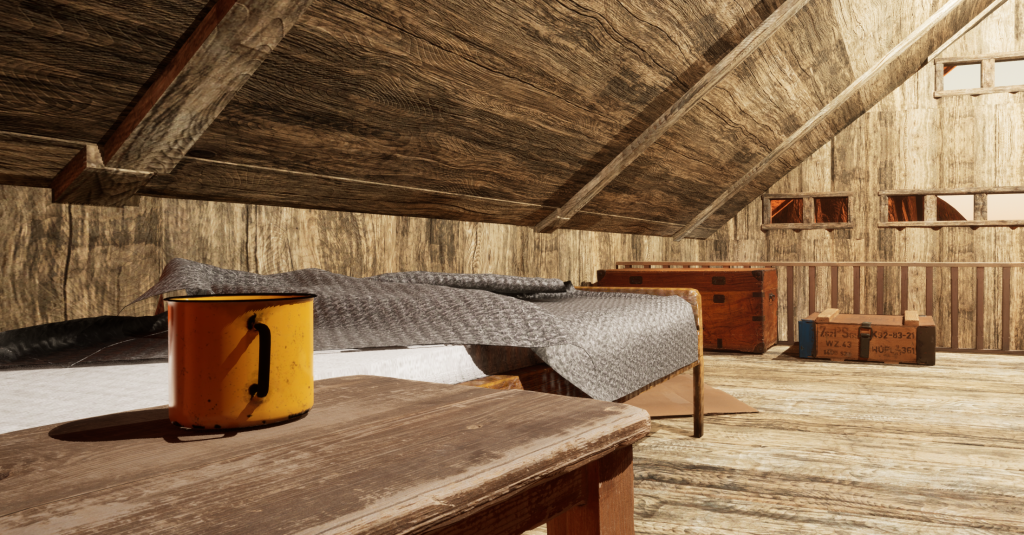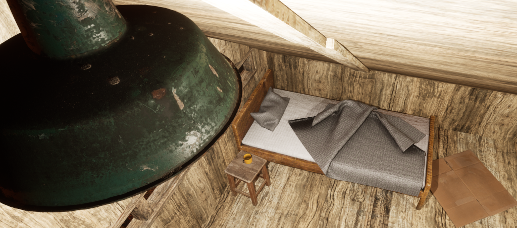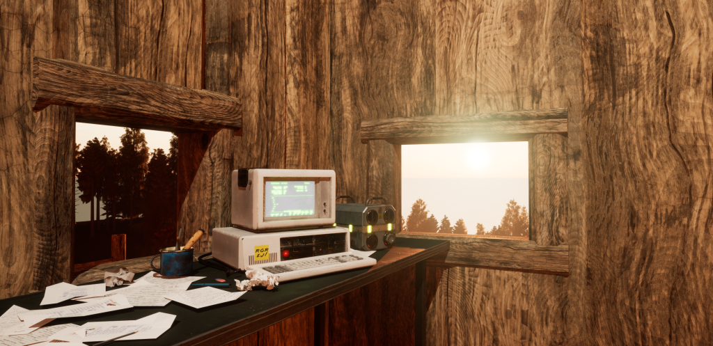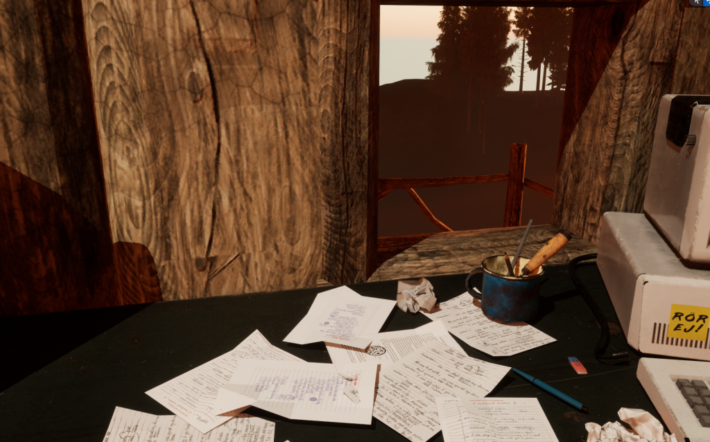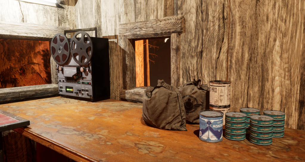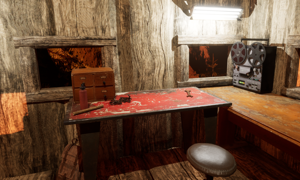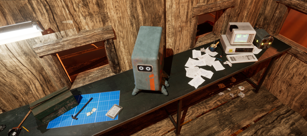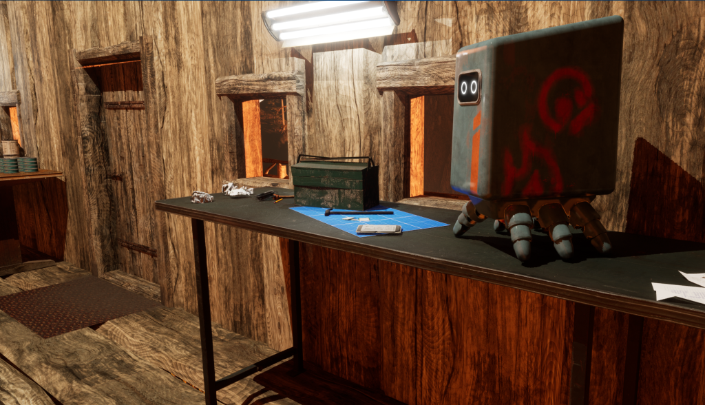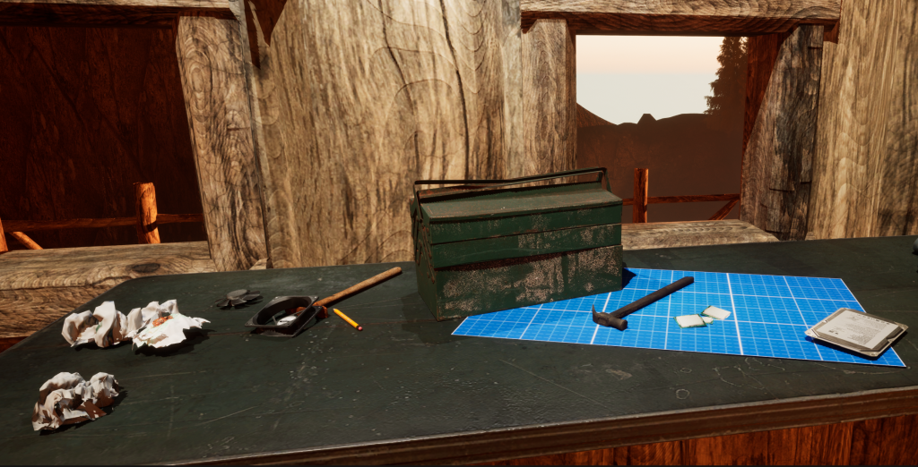 To improve the furnishing of the cabin I would add more clutter to the desks and more tech and electrical items and it was hard to find usable electronics that would look good in the environment without them being too futuristic for a dystopian world. I would also think about editing the blueprint of paper assets to contain sketches of the centre piece asset yo show that the person who lives in the cabin built it.