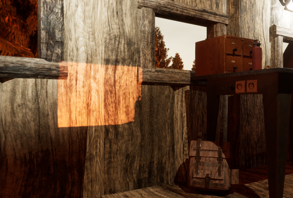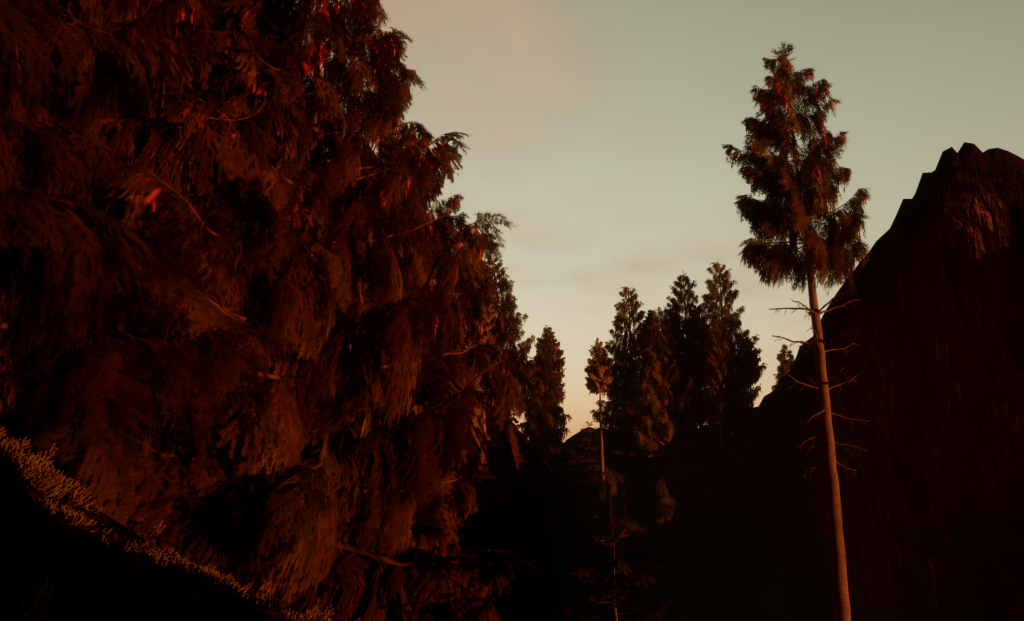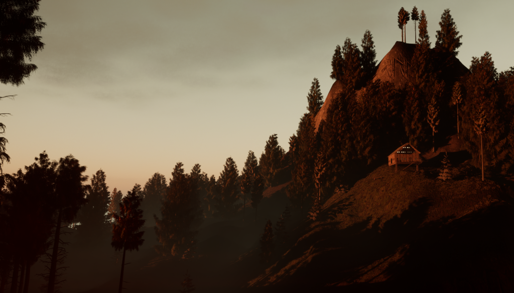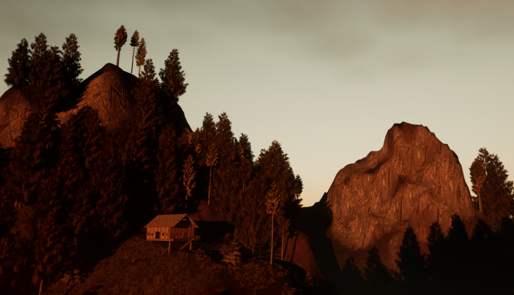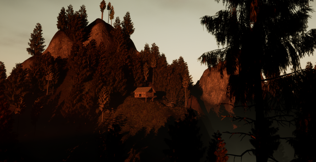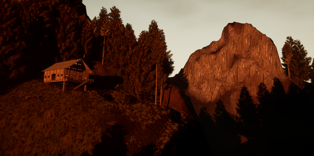The landscape is well constructed and the foliage is well placed; if I were to create the landscape again I would like to place the mountain the cabin sits on further forward as the mountain behind was difficult to sculpt as it is cut off of the edge of landscape. I would also add more assets to the outdoor environment that aren’t foliage such as rocks or fallen trees to add variety to the landscape.